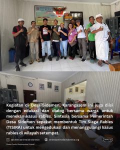 Dalam diskusi bersama Sintesia dengan Kepala Desa Sidemen yang dihadiri beberapa kanwil, Bhabinkamtibmas serta dokter hewan dari Puskeswan, dicapai kesepakatan tentang membentuk Tim Siaga Rabies (Tisira) dan strategi management pengendalian HPR. Sinergi ini diharapkan dapat mengidentifikasi dan mengatasi persoalan terkait rabies.
